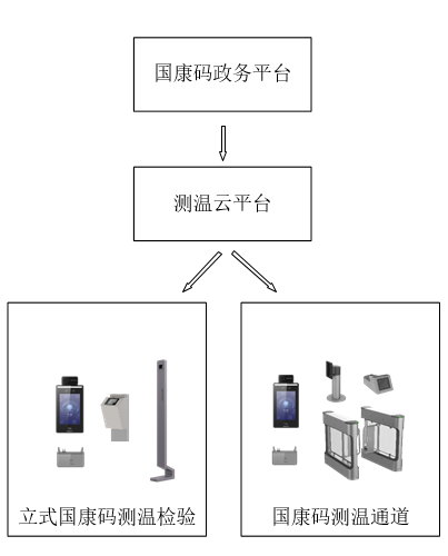 国康码方案,可通过立式支架部署,也可搭配人员通道产品进行部署。目前,测温数据云平台已经完成与国家政务服务平台对接,使用国康码方案,可以采用下列三种认证模式进行核验