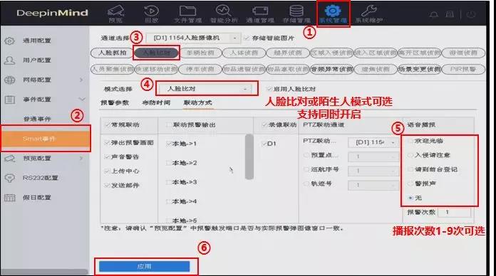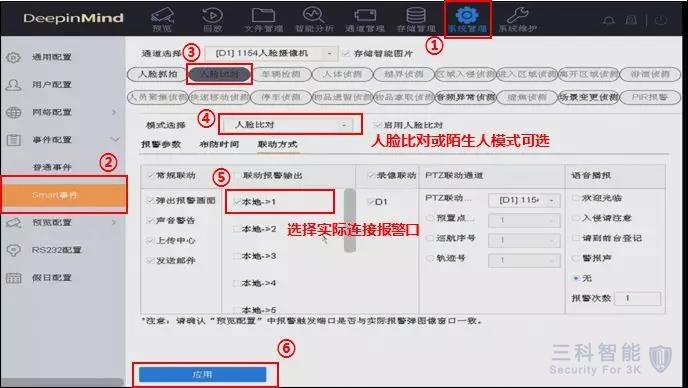 联动报警事件设置:设置联动报警事件前提是已根据实际场景需要,完成安装调试人脸抓拍摄像机及智脑NVR中的人脸库设置,点击【系统管理】—【事件配置】—【smart事件】—【人脸比对】,进入人脸比对配置界面,勾选【报警输出】中的本地报警口后选择确定即可。
