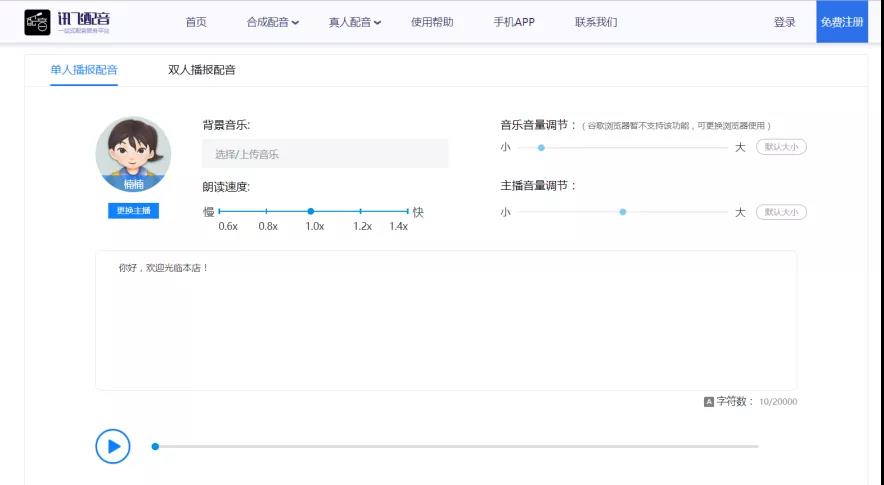 例如“您好,欢迎光临本店”,更改音量、语速、主播类型,选择试听后付费即可以下载。