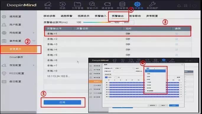 报警输出设置:在智脑NVR本地界面,【系统管理】—【事件配置】—【普通事件】—【报警输出】中确认报警输出号及延时时间,后面板有多个报警输出口需要和实际联动的报警输出选择进行对应。